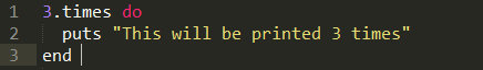 The times loop can be used on any variable containing a number or used on a number itself. In the following example, the first loop is run 3 times and the second loop is run however many times is input by the user. If you input 12, it would run 12 times. You'll notice that the times loop uses the dot syntax (3.times do) rather than the keyword syntax used by the while and until loop. This has to do with how the times loop works under the hood but it's used in the same way a while or until loop is used.