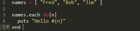 The each loop is perhaps the most useful of all the loops. The each loop will take a list of variables and run a block of statements for each of them. Since almost all computing tasks use lists of variables and have to do something with each of them in the list, the each loop is by far the most common loop in Ruby code. One thing to note here is the argument to the loop's block of statements. The value of the current variable the loop is looking at is assigned to the variable name in pipe characters, which is |n| in the example. The first time the loop runs, the n variable will be equal to "Fred," the second time the loop runs it will be equal to "Bob" and so on.